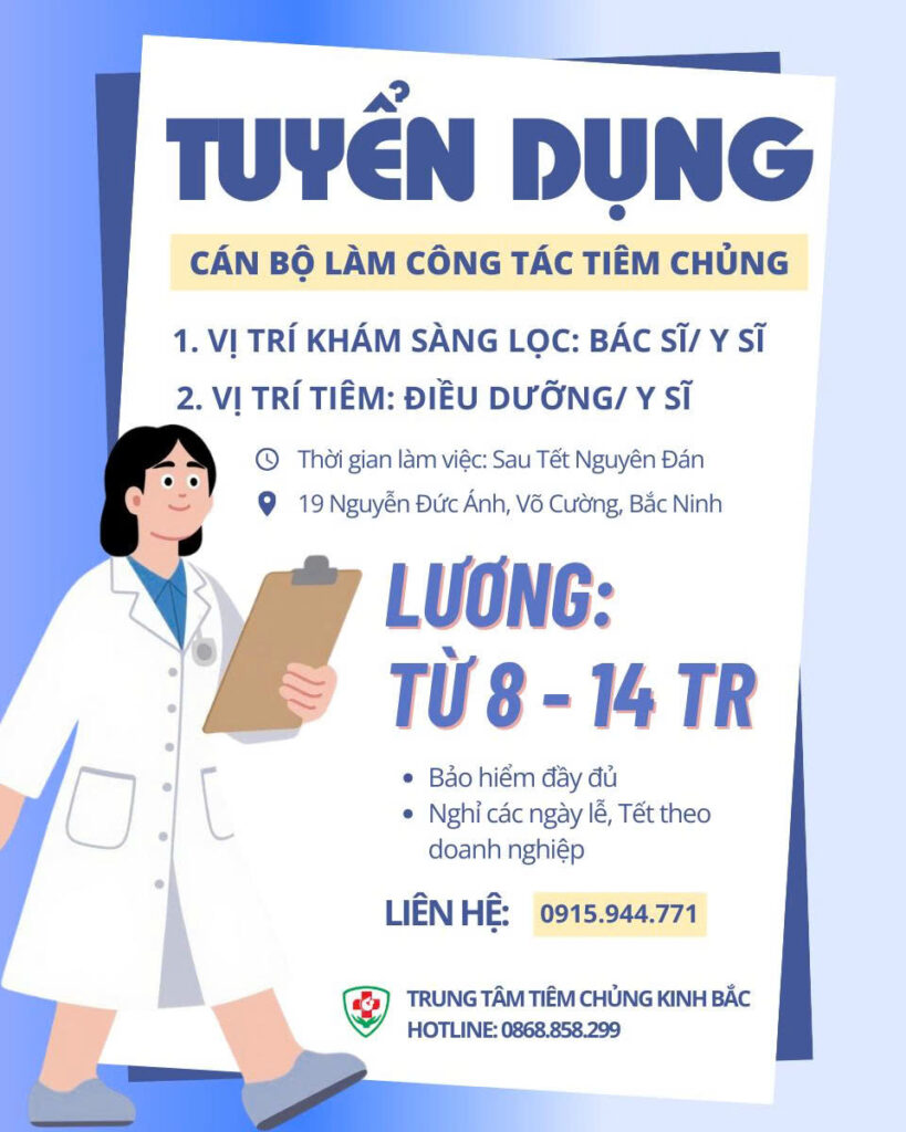 Nhằm mở rộng đội ngũ nhân sự và chuẩn bị cho kế hoạch hoạt động sau Tết Nguyên Đán, Trung tâm Tiêm chủng Kinh Bắc thông báo tuyển dụng các vị trí chuyên môn Y tế với các nội dung cụ thể như sau: