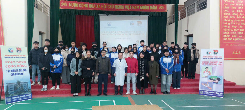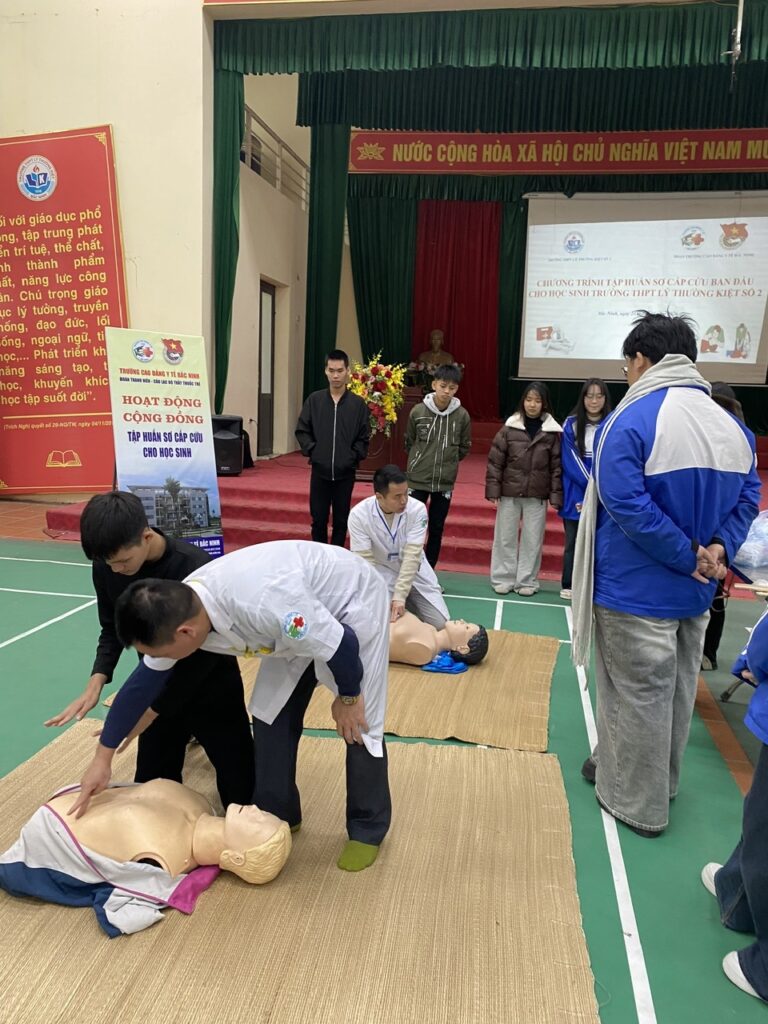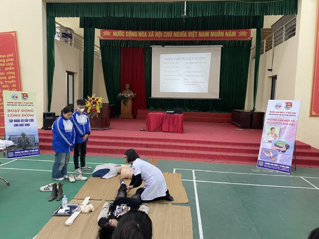 Tiêu biểu trong chuỗi hoạt động là hoạt động tập huấn sơ cấp cứu ban đầu cho học sinh Trường THPT Lý Thường Kiệt số 2 diễn ra vào ngày 23/01/2026. Chương trình do Đoàn Thanh niên Trường Cao đẳng Y tế Bắc Ninh phối hợp với Đoàn trường THPT Lý Thường Kiệt số 2 tổ chức, với sự tham gia của các giảng viên, thầy thuốc trẻ giàu kinh nghiệm chuyên môn.Tại buổi tập huấn, học sinh được trang bị kiến thức và kỹ năng cơ bản về sơ cứu cầm máu, sơ cứu gãy xương, hồi sinh tim phổi và xử trí hóc dị vật, kết hợp giữa lý thuyết và thực hành trực quan. Hoạt động không chỉ nâng cao kỹ năng xử lý tình huống khẩn cấp cho học sinh mà còn khẳng định vai trò, uy tín của tuổi trẻ ngành y trong công tác chăm sóc, bảo vệ sức khỏe cộng đồng.